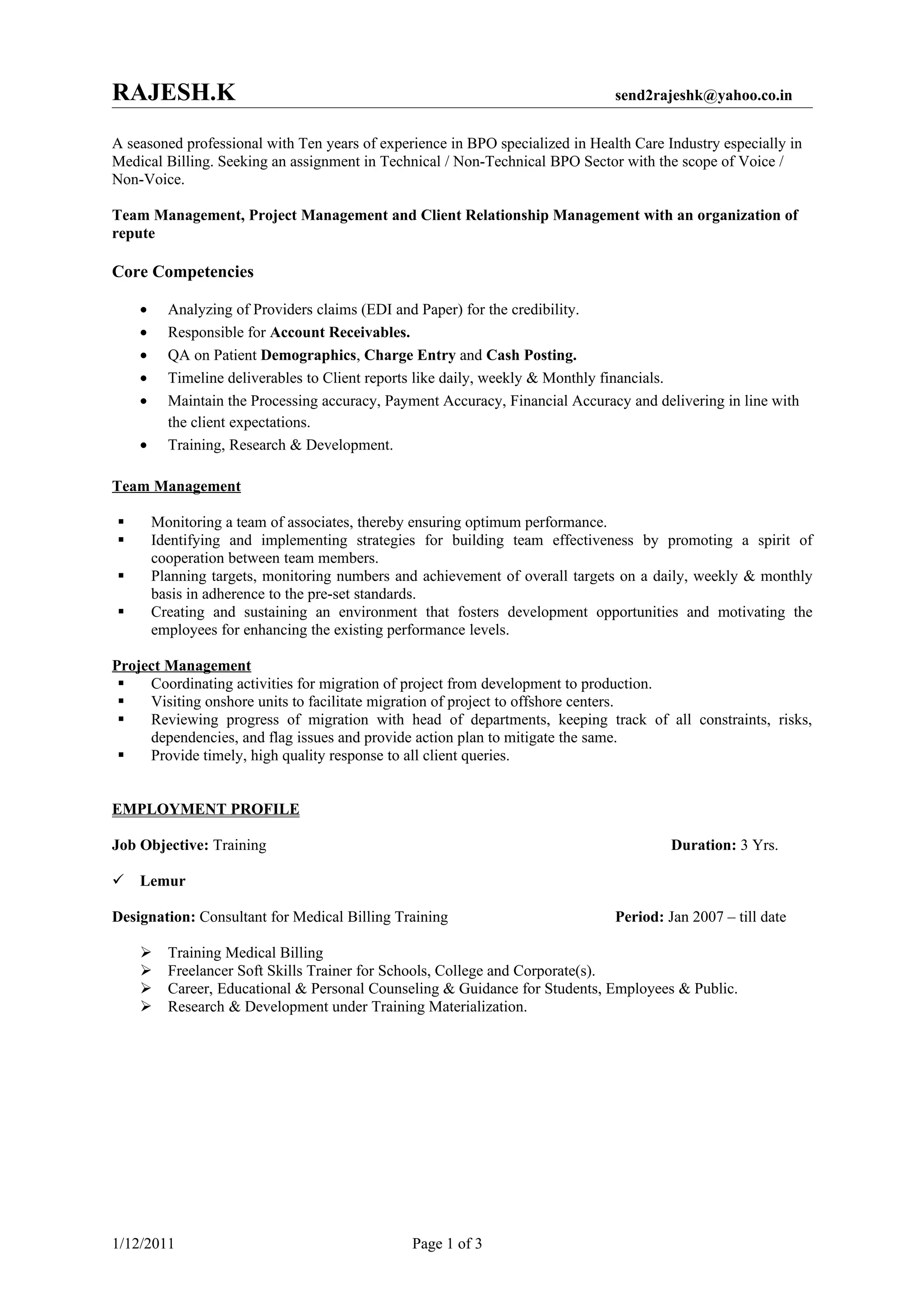 Rajesh K. is a seasoned professional with over ten years of experience in the BPO sector, specializing in healthcare and medical billing. He seeks a role in either technical or non-technical BPO with strong competencies in team and project management, client relationship management, and training. His career includes significant achievements in project transitions and software implementations, alongside educational qualifications in counseling and computer applications.