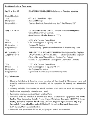 Rajesh Roushan is a mechanical engineer with over 6 years of experience in coal handling plants. He has worked on plants with capacities up to 1800TPH. His responsibilities have included commissioning, operation, maintenance, safety management, and meeting generation targets. He is currently a senior engineer at Feedback Power O&M Service Pvt. Ltd. where he oversees a 1800TPH plant.