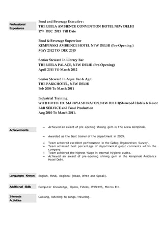 Rajinder Kumar is a hospitality professional with over 8 years of experience in food and beverage service operations at various 5-star hotels. He currently works as a Food and Beverage Executive at The Leela Ambience Convention Hotel New Delhi. His career has included roles at Kempinski Ambience Hotel New Delhi, The Leela Palace New Delhi, and The Park Hotel New Delhi. He has a diploma in restaurant and counter service from Delhi Institute of Hotel Management and Catering. His core competencies include team development, operations management, guest relations, and training.