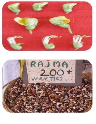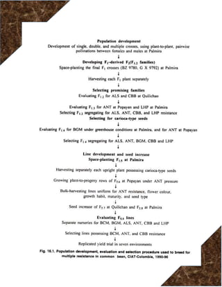 This document provides information on breeding methods for French beans. It discusses the center of origin, distribution, breeding objectives, and different breeding procedures used, including pedigree selection, bulk breeding, backcrossing, and marker-assisted selection. The document also covers breeding for disease resistance, insect resistance, environmental stress tolerance, canning quality, and yield improvement. It reviews molecular tools used in bean breeding, such as markers, genomics, and QTL mapping. Finally, it discusses current developments and issues regarding genetically modified beans.