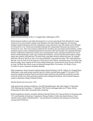 Kartini dikenal sebagai pelopor kebangkitan perempuan Indonesia. Ia berasal dari keluarga bangsawan di Jepara namun menginginkan pendidikan dan kesetaraan bagi perempuan. Kartini berkorespondensi dengan sahabat-sahabat Belanda dan mengungkapkan pemikirannya tentang kondisi sosial dan emansipasi perempuan lewat surat-suratnya. Surat-surat Kartini kemudian diterbitkan menjadi buku yang menginspirasi gerakan