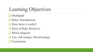 The document discusses the Rake receiver, which is used to counter the effects of multipath fading in wireless communications. It works by using multiple "fingers" to collect different time-shifted versions of the original signal transmitted over multiple paths. Each finger correlates and extracts one of the multipath components. The outputs are then weighted and combined to provide a better estimate of the transmitted signal. This allows the Rake receiver to equalize the effects of multipath and improve the signal-to-noise ratio. While useful for CDMA, W-CDMA and other technologies, Rake receivers are also more complex and expensive than conventional receivers.