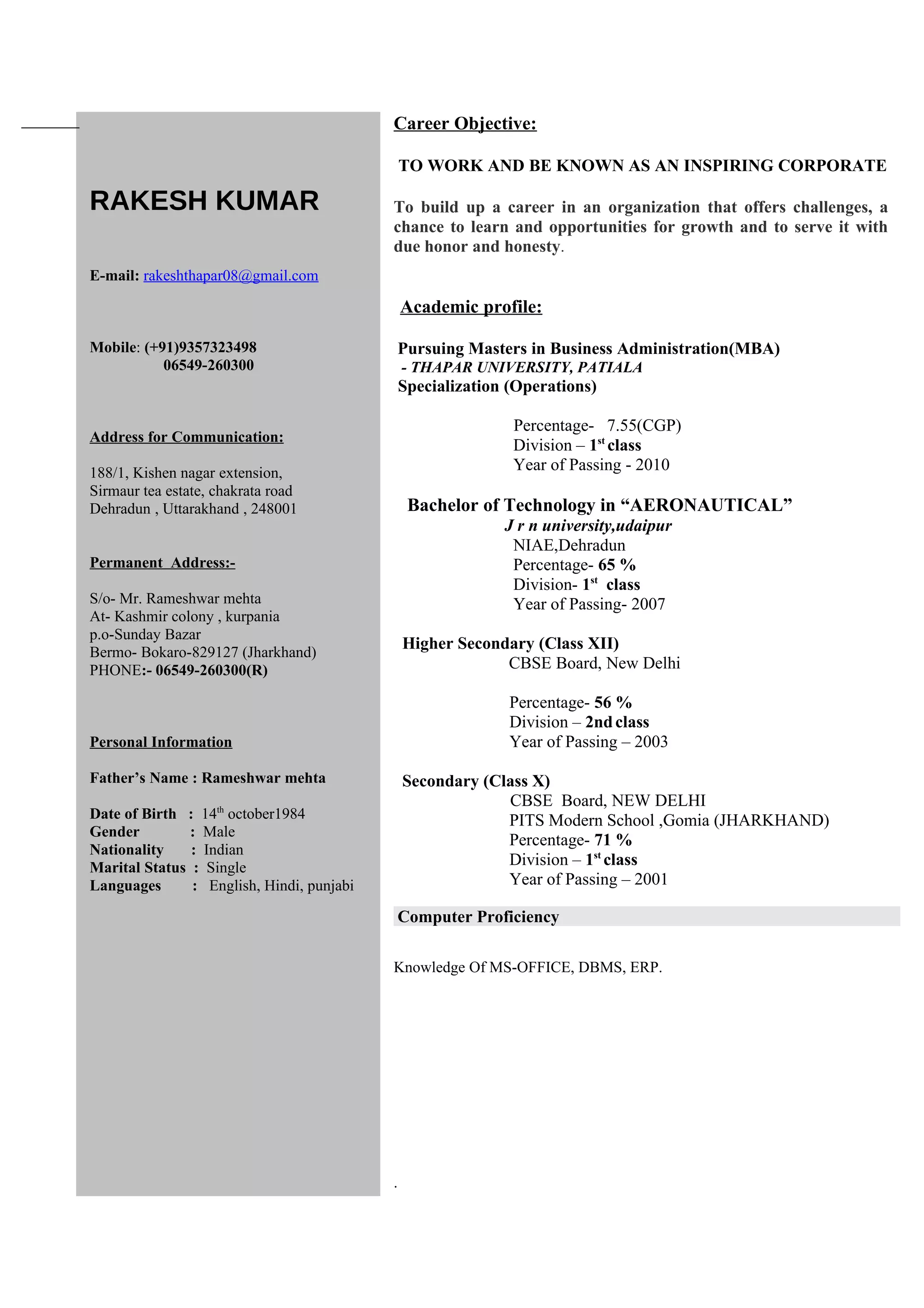 Rakesh Kumar aims to build a career in a challenging organization while maintaining integrity and honor. He is currently pursuing an MBA with a specialization in Operations and holds a bachelor's degree in Aeronautical Engineering. His qualifications include various academic achievements, project experiences, and proficiency in multiple languages and computer skills.