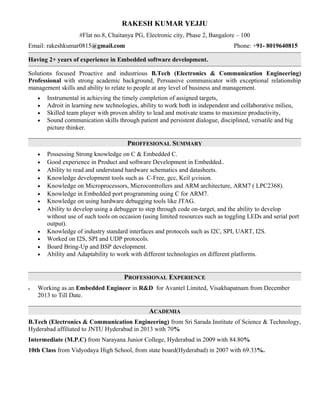 Rakesh Kumar Yejju is an embedded software engineer with over 2 years of experience. He has strong knowledge of C and embedded C and has experience in product and software development. He has worked on projects involving voice over IP, UHF satellite communication systems, and Ethernet interfaces using microcontrollers like ARM7 and programming tools like Keil uVision. He is a quick learner, hardworking, and skilled in both independent and collaborative work.