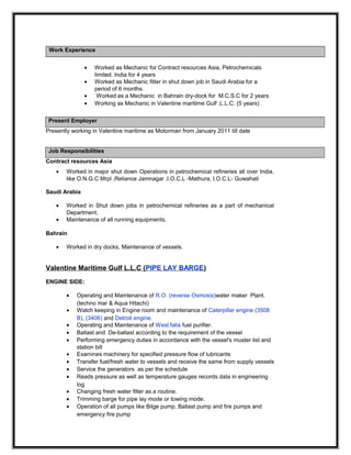 Rakesh Kumar is seeking a challenging position utilizing his knowledge and skills. He has experience working as a mechanic in India, Saudi Arabia, and Bahrain on ships and in refineries. Currently, he works as a motorman for Valentine Maritime Gulf L.L.C., where his responsibilities include engine room duties, deck machinery maintenance, welding, and safety participation. He has obtained several certifications in safety, first aid, welding, and has a CDC and passport valid through 2021.