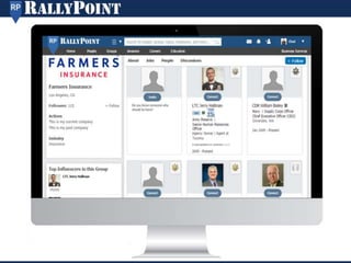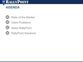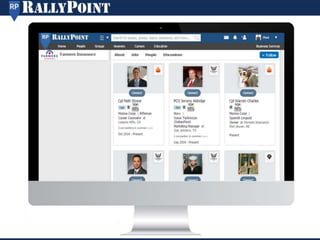 This document provides an overview and agenda for RallyPoint solutions. It summarizes that RallyPoint is the largest online military network with nearly 900K members. It helps translate military experience for civilian jobs and build talent pipelines for transitioning service members. Marketing solutions allow targeted communications and videos within the military newsfeed of over 1M monthly visitors. RallyPoint helps connect the tight-knit military community and address challenges in transitioning to civilian careers.