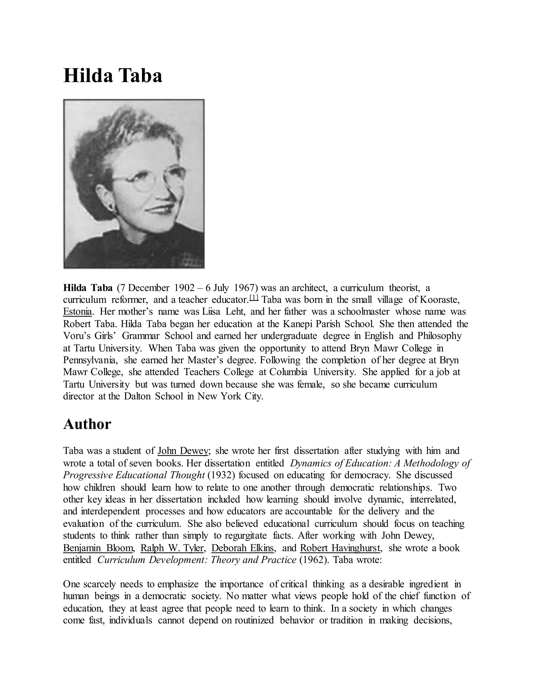 Hilda Taba was an Estonian-American educator and curriculum theorist. She received degrees from Tartu University and Bryn Mawr College before earning her PhD from Teachers College at Columbia University. Taba was influenced by the ideas of John Dewey and focused on developing curriculum that encouraged critical thinking and problem solving skills in students. She believed curriculum should be tailored to students' developmental levels and connect new information to prior knowledge. Taba created a model for curriculum development that involved identifying student needs, defining objectives, selecting content and organization, choosing learning experiences, and evaluating outcomes. Her work emphasized teacher involvement and had a lasting influence on American education.