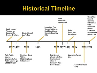 The Ralph Lauren Competitive Presentation outlines the brand's history, heritage, and product scope since its founding, detailing its evolution from a tie company to a major global lifestyle brand with revenues of $4.2 billion. The document describes Ralph Lauren's various collections, including men's, women's, children's wear, fragrances, home products, and accessories, highlighting their target demographics and core values of luxury, classic style, and quality. Additionally, it discusses marketing strategies, including exclusive collections and distribution channels to elevate the brand image and improve sales efficiency.
