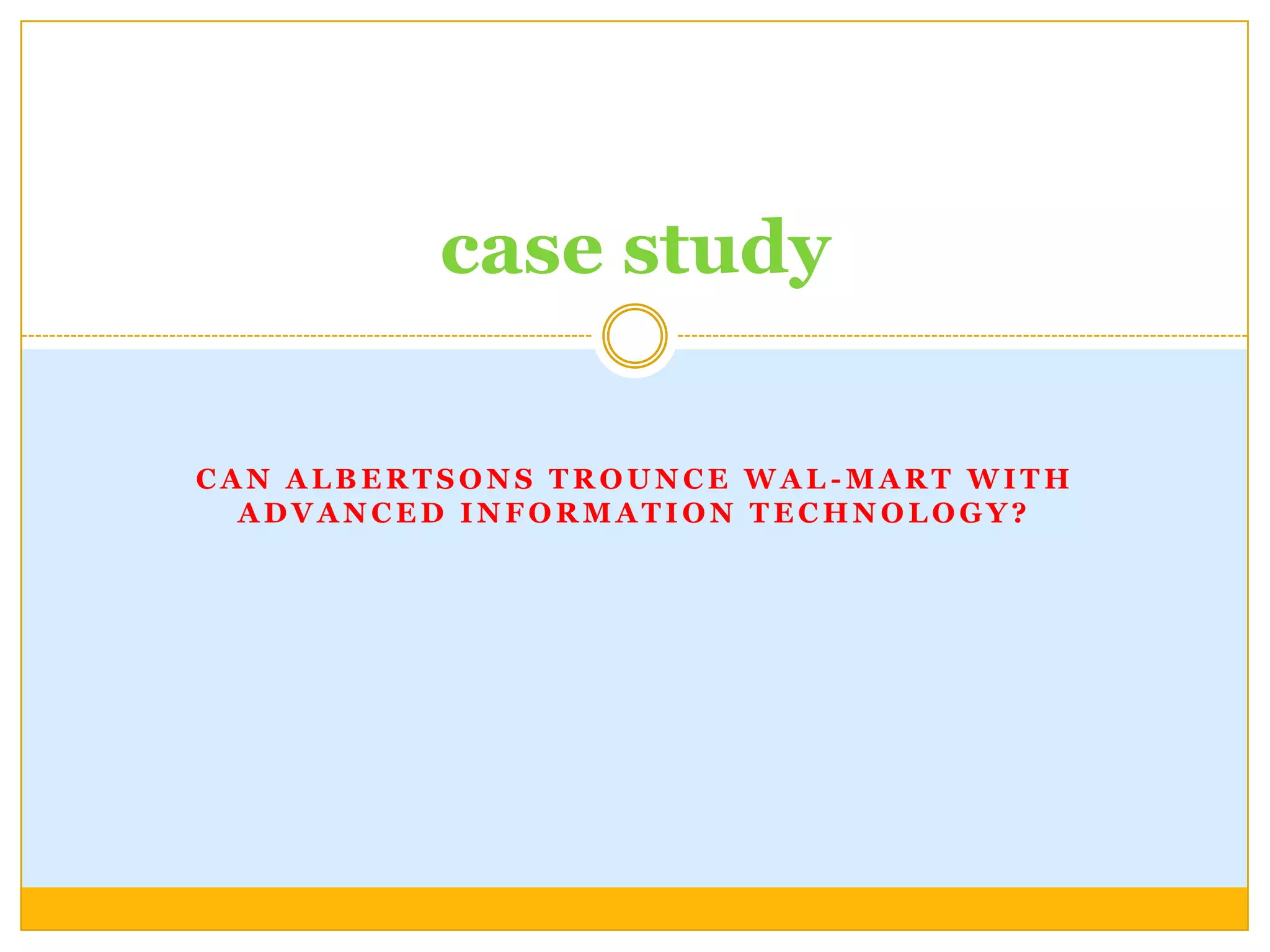 Albertsons is one of the largest retail food and drug chains in the United States with over 2,300 stores. While Wal-Mart currently has higher annual grocery revenue than Albertsons, Albertsons has invested heavily in information technology to better understand customer buying habits and coordinate their supply chain. Albertsons aims to use advanced analytics and customer data to provide personalized offers, improve operations and inventory management, and ultimately surpass Wal-Mart in grocery sales.