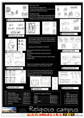 The document provides specifications for parking spaces, compound walls, and lighting/ventilation requirements for religious campus buildings. It lists minimum parking space dimensions of 3m x 6m for individual spaces and 2.75m x 5m for common spaces. The area for each parking space must be at least 23 sqm for open parking, 28 sqm for ground floor covered parking, and 32 sqm for basement parking. Compound walls can be up to 1.5m high or 2.4m high if the top 0.9m is open. Lighting and ventilation requirements specify a percentage of the floor area that must be provided, ranging from one-tenth to one-sixth depending on climate. It also lists