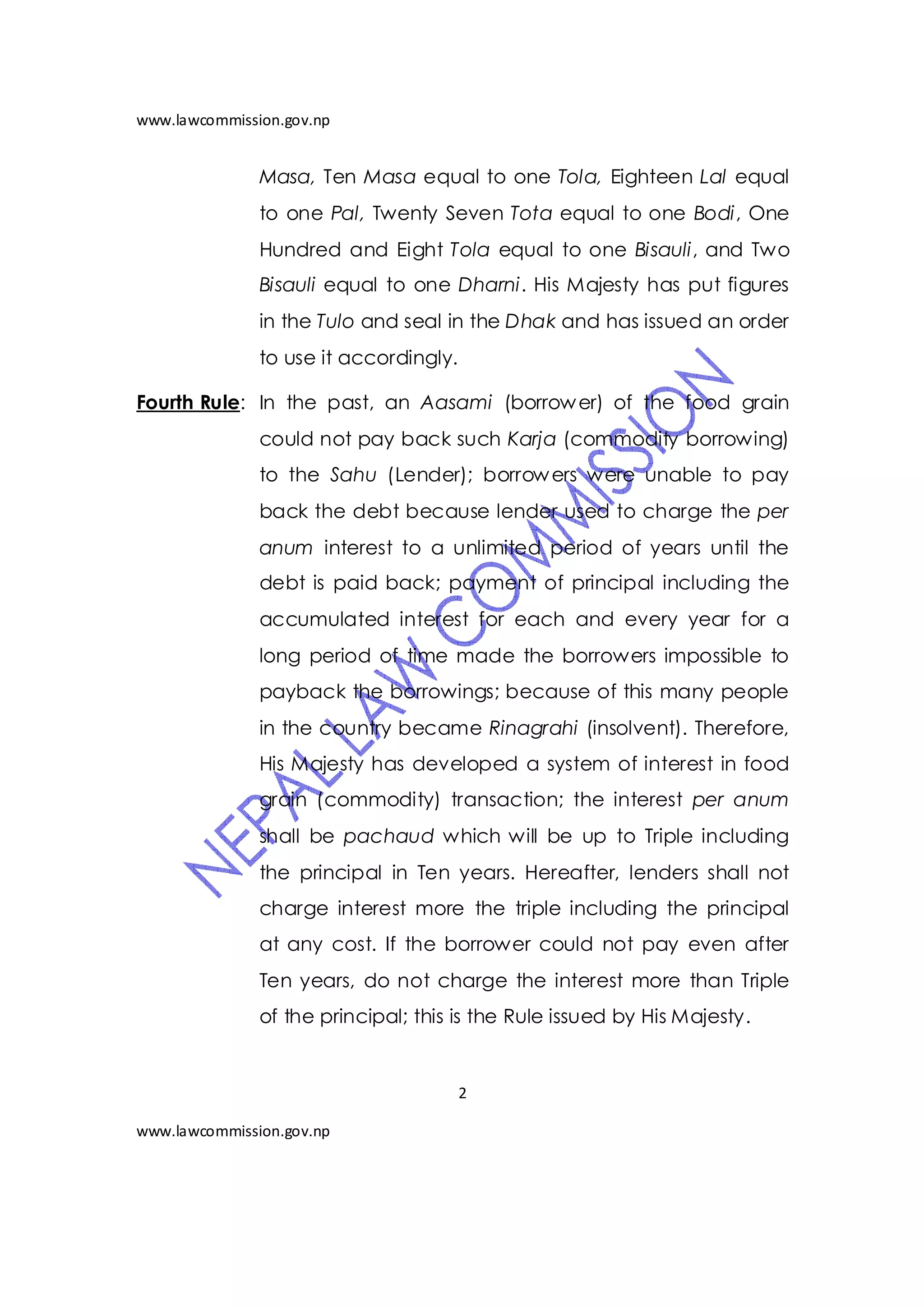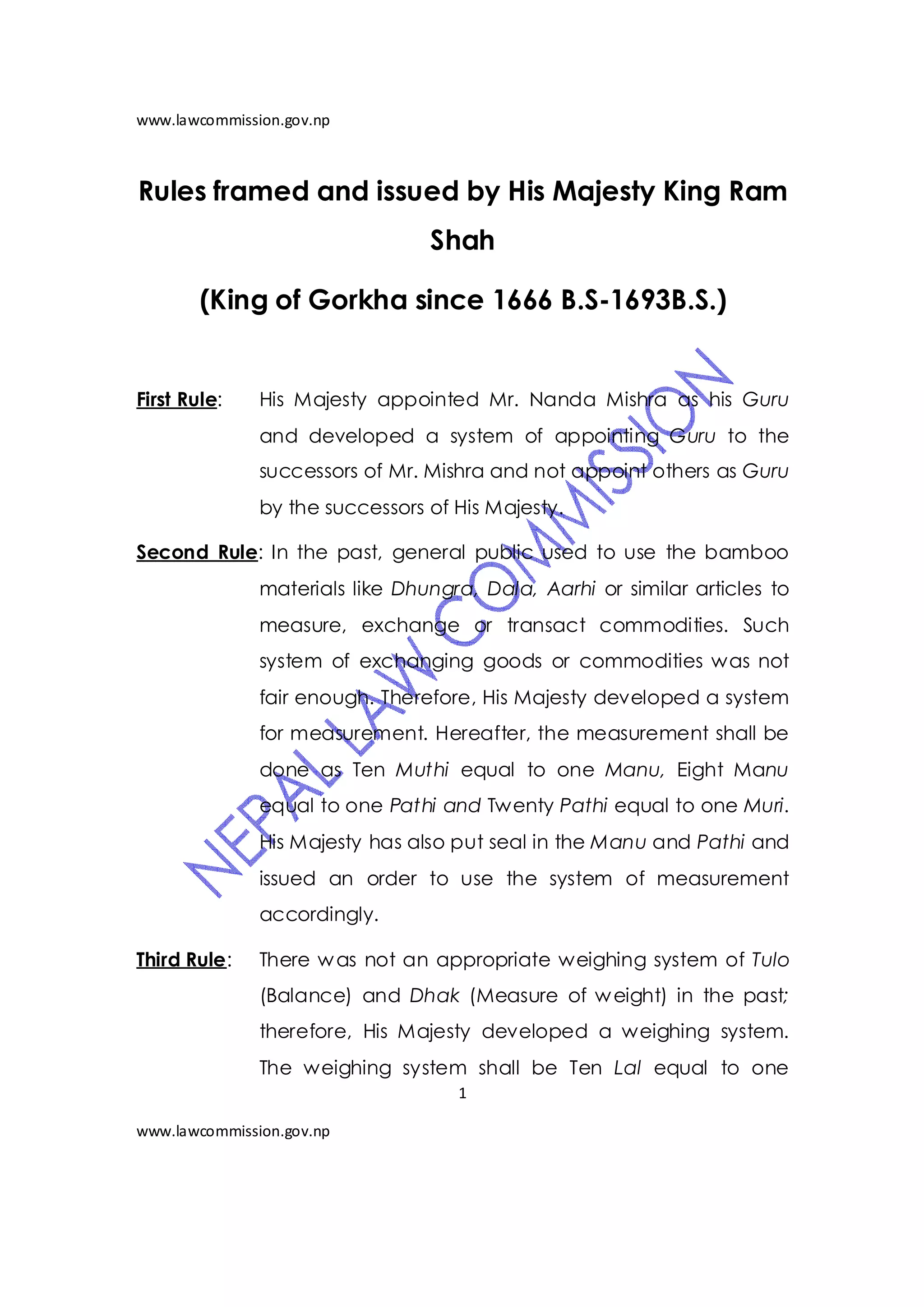 King Ram Shah established several rules to standardize measurement systems, lending practices, and resolve petty disputes. The rules standardized units of measurement for goods, established interest rates for lending of grains/cash, and directed minor disputes over water access, oil production, or irrigation to be resolved without bringing cases to court. The rules aimed to promote fairness in economic transactions and reduce insolvency from unreasonable debt burdens.