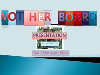 The document discusses motherboards and their components. It defines a motherboard as a printed circuit board that holds crucial electronic components like the CPU and memory. It communicates between these components. The document discusses different types of motherboards like AT, ATX, mini ATX and their specifications. It also describes the various components found on motherboards like the CPU, memory, ports, expansion slots and their functions.