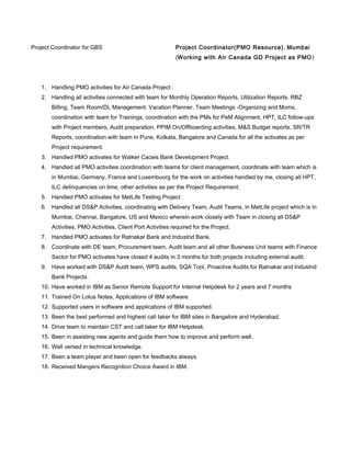 This document contains the resume of Rama Choudary. It summarizes his contact information, career objective, academic qualifications, technical skills, work experience and personal details. Rama has over 15 years of experience in software development, project management and technical support roles. He has worked with various organizations like IBM, Wipro, Sitel and as a volunteer. His technical skills include languages like C, C++, SQL and frameworks like HTML. He is looking for a role that allows him to apply his conceptual knowledge and skills in project management.