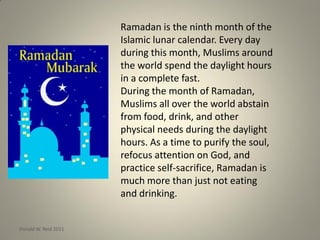Ramadan is the ninth month of the Islamic lunar calendar, during which Muslims fast from food and drink during daylight hours. It is a month for spiritual purification and focus on God through prayer, acts of faith, and self-sacrifice. Strict observance of the fast is required, including abstaining from food, drink, smoking and sexual relations during daylight hours. The fast is broken each evening with a meal called iftar, followed by visiting family and friends. Ramadan commemorates the first revelation of the Quran to Muhammad. It concludes with the Eid al-Fitr holiday marking the end of fasting.