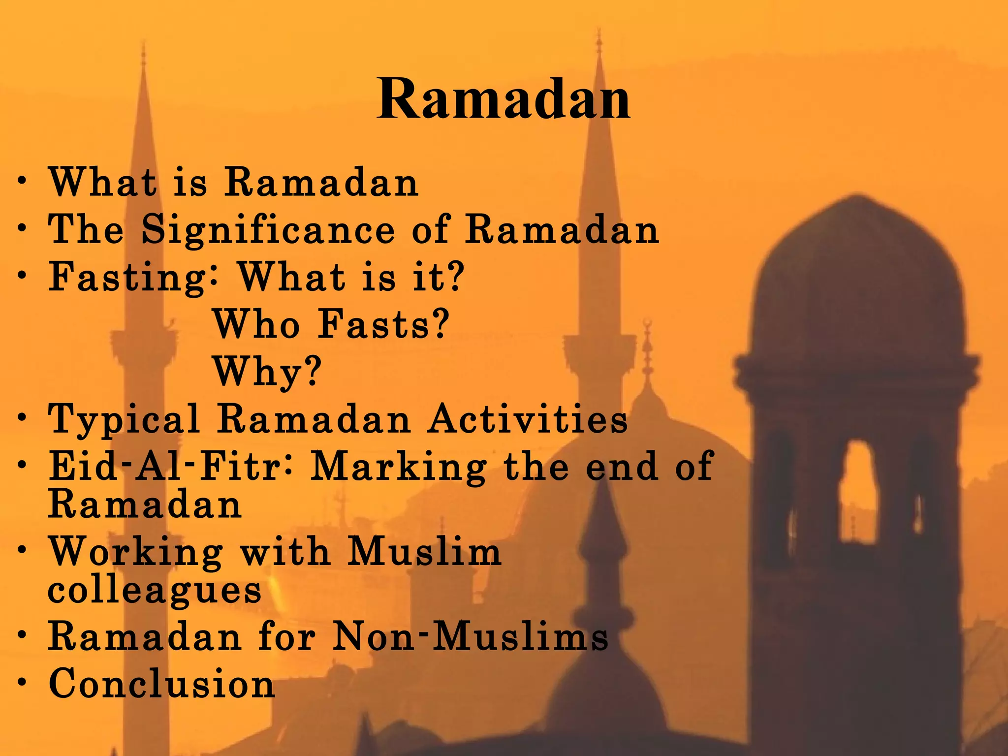 Ramadan is the ninth month of the Islamic lunar calendar during which Muslims fast from dawn to sunset. It is one of the five pillars of Islam and commemorates when the Quran was first revealed to the prophet Muhammad. Fasting is meant to bring worshippers closer to God through increased prayer, reflection, and good deeds. At the end of Ramadan, Muslims celebrate Eid al-Fitr with feasting, gift-giving, and acts of charity. Non-Muslims are encouraged to be respectful of their fasting colleagues during this holy month.