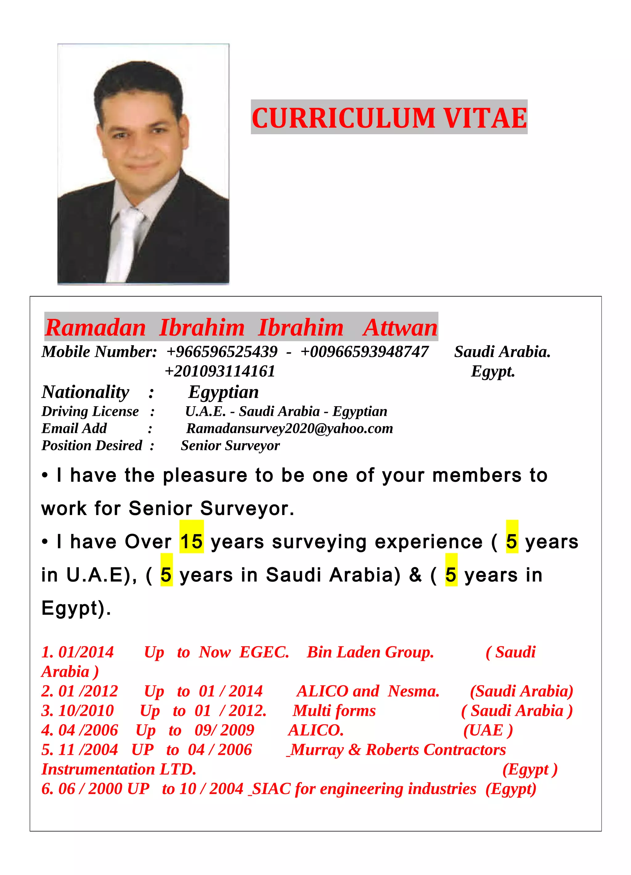 Ramadan Ibrahim Ibrahim Attwan is an Egyptian national seeking a position as a senior surveyor with over 15 years of surveying experience in the UAE, Saudi Arabia, and Egypt. He has worked on large projects such as King Abdulaziz International Airport, Olaya Towers, and Dubai Mall. His qualifications include a surveying degree and skills with surveying instruments, AutoCAD, and data collection software.