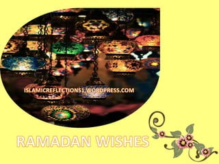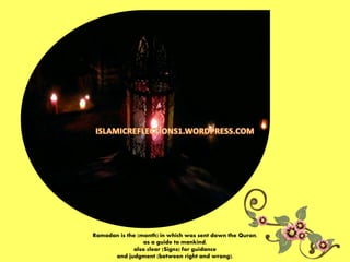 The document discusses Ramadan and wishes for blessings during the holy month. It notes that Ramadan is the month in which the Quran was revealed, providing guidance and judgment. It includes passages from the Quran and wishes for blessings from Allah, a blessed Ramadan, happiness and peace in homes.