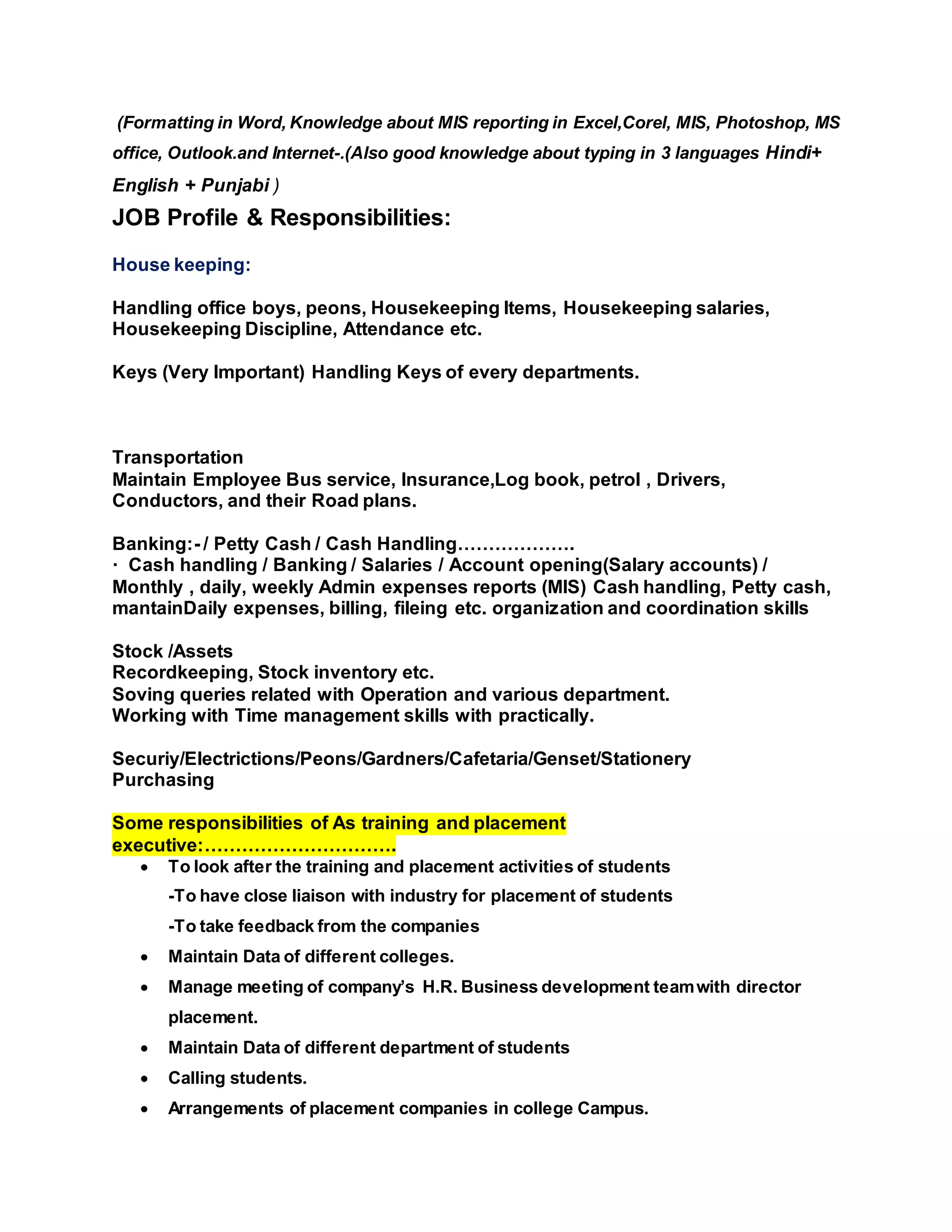 The document is a curriculum vitae for Raman Jeet Singh Swani. It outlines his educational qualifications which include a 6 month diploma in computers, graduation from Punjabi University Patiala in 1998, and passing secondary and matriculation exams. It details over 6 years of work experience in administration roles at various companies, including his current role as an admin/training and placement executive. It provides an extensive list of responsibilities in areas like housekeeping, transportation, purchasing, asset management, attendance, and liaison. The CV demonstrates Swani's computer skills and qualifications for administrative and operations management positions.