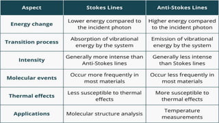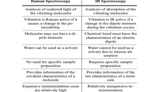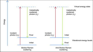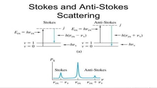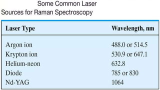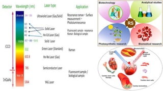 This document provides an overview of Raman spectroscopy. It begins with a brief history noting its discovery in 1928 by Raman for which he later won a Nobel Prize. It then covers the basic principles of Raman spectroscopy including the Raman effect, Stokes and anti-Stokes scattering. Instrumentation components like lasers, filters, and detectors are described. Different types of samples that can be analyzed including solids, liquids, and gases are mentioned. Finally, applications of Raman spectroscopy in various fields like chemistry, polymers, mixtures, inorganic/organic species, and biology are highlighted.
