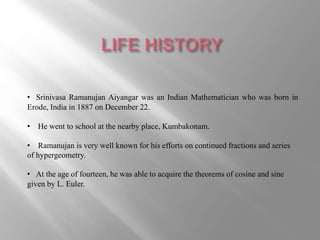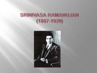Srinivasa Ramanujan Aiyangar was an Indian mathematician born in 1887 in India. He showed great talent and self-taught himself advanced mathematics from a young age. In 1913, he sent letters containing his original mathematical research to professors in Cambridge University. This led to him receiving a scholarship to study at Trinity College, Cambridge where he collaborated with professor G.H. Hardy and made significant contributions to mathematical analysis, number theory, infinite series, and continued fractions. Despite dying young at the age of 32, Ramanujan made substantial contributions to mathematical research.