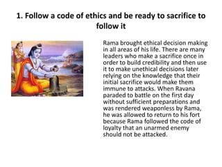 The document summarizes entrepreneurial lessons that can be learned from the Hindu epic Ramayana. It describes 7 key lessons: 1) follow a code of ethics and be willing to sacrifice for it, 2) have a future-oriented plan, 3) stand courageously in the face of adversity, 4) treat everyone equally, 5) consult subordinates and allow opposing opinions, 6) be armed with knowledge, strategy, and commitment, 7) ensure the brand is bigger than its owner. It concludes by emphasizing the importance of having a clear vision and cause worth fighting for.