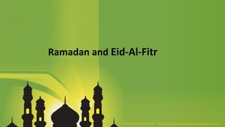 Ramadan is the ninth month of the Islamic calendar when Muslims worldwide fast from dawn to sunset. It is a time of increased prayer, charity, and spiritual reflection. Fasting is one of the Five Pillars of Islam and is meant to bring devotees closer to God through self-discipline and gratitude. Ramadan ends with the festival of Eid-al-Fitr, where Muslims celebrate and give gifts to children.