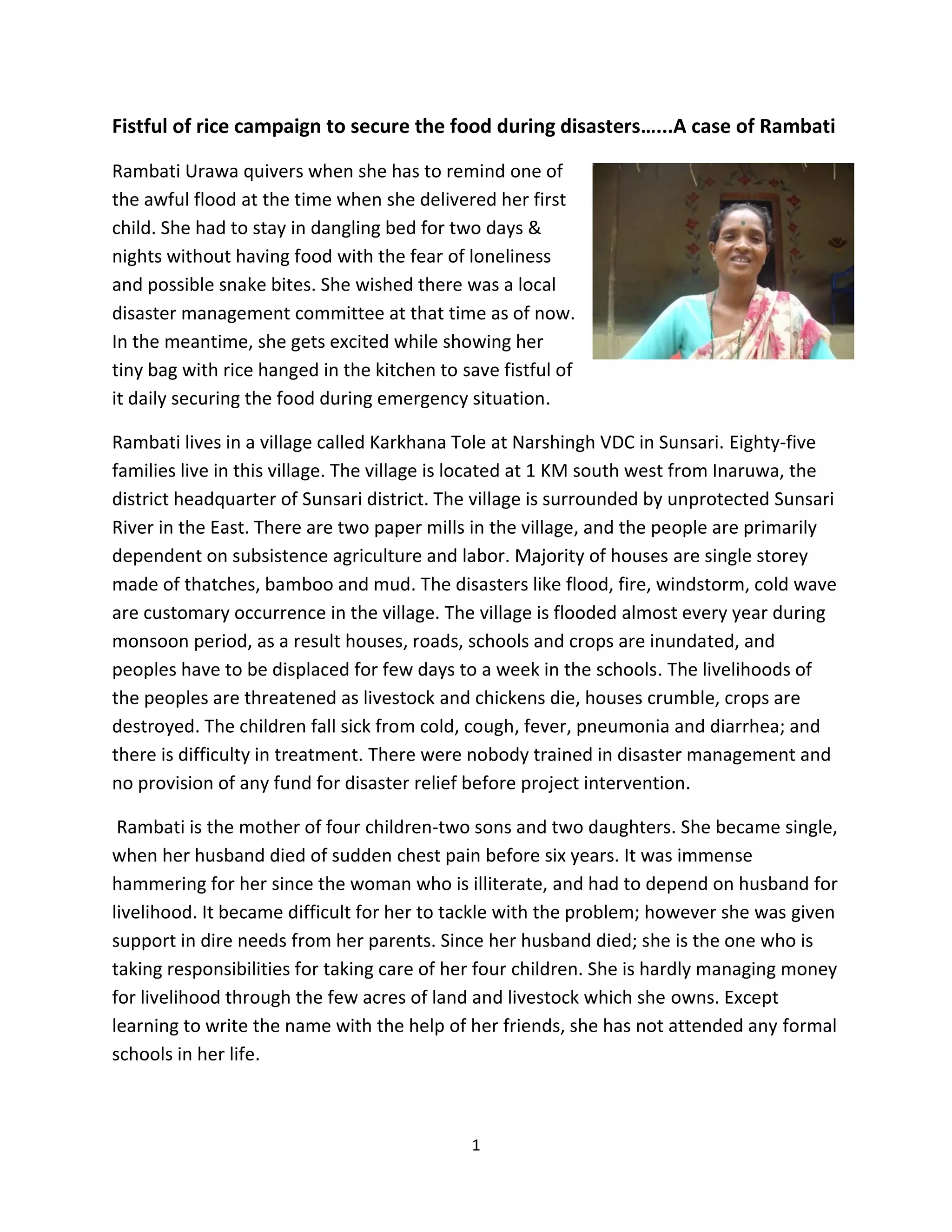 3) With support from a local NGO, the community formed a disaster management committee and began collecting "fistfuls of rice" daily to stockpile food for emergencies. Rambati is an active participant in these efforts.