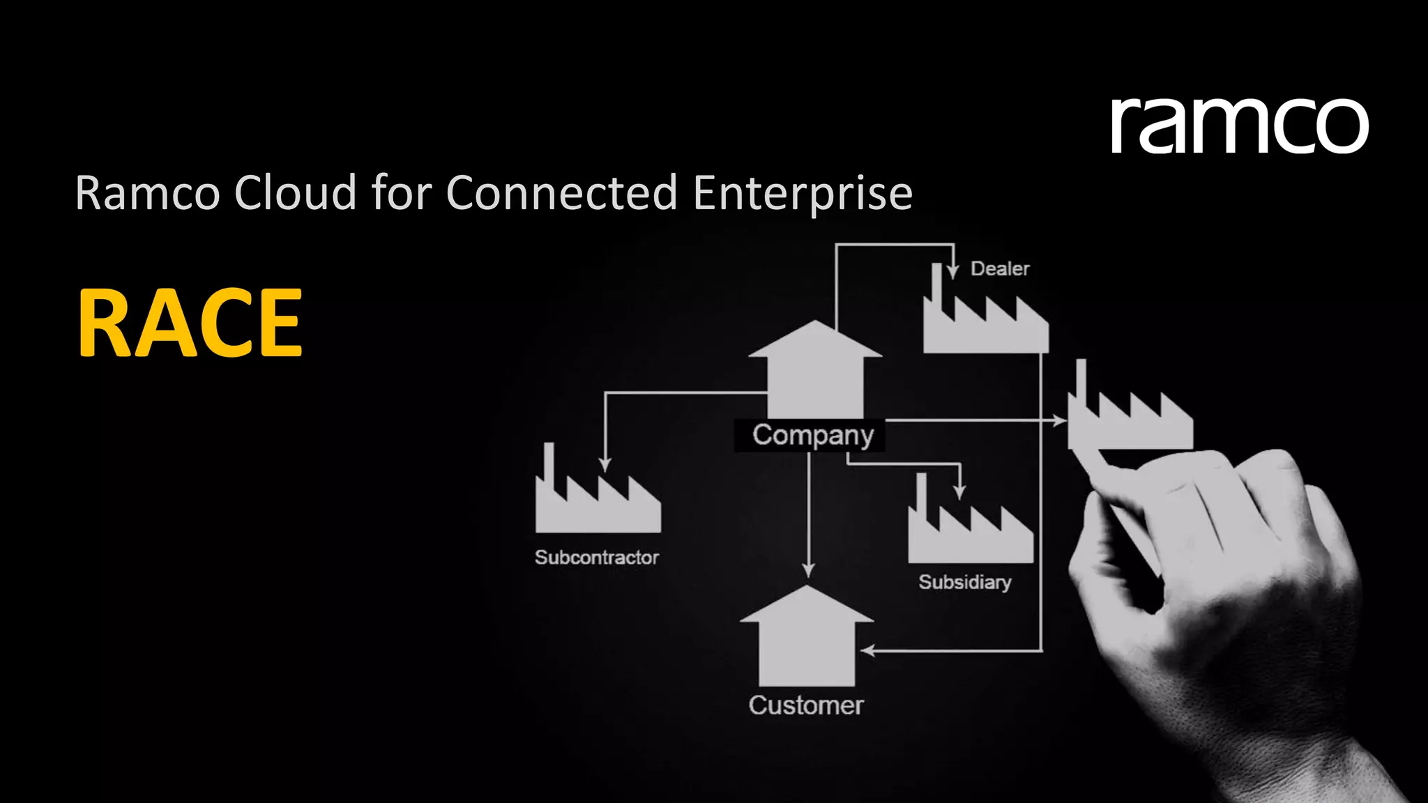The document discusses Ramco's cloud-based ERP solution, Race, which integrates various business functions across a complex ecosystem of dealers, subsidiaries, and contractors to improve communication and operational efficiency. It highlights key benefits such as rapid deployment, real-time inventory visibility, and cost savings in implementation and training. The solution aims to simplify processes, enhance collaboration, and provide a standardized enterprise resource management system for global organizations.