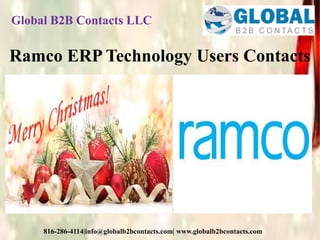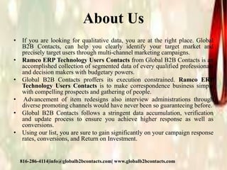 Global B2B Contacts LLC specializes in providing segmented mailing lists of professionals and decision-makers, particularly in relation to Ramco ERP technology users. Their services include a comprehensive database with verified contact information and high response rates for marketing campaigns. They also offer a free consultation and can assist with appending missing data for businesses.