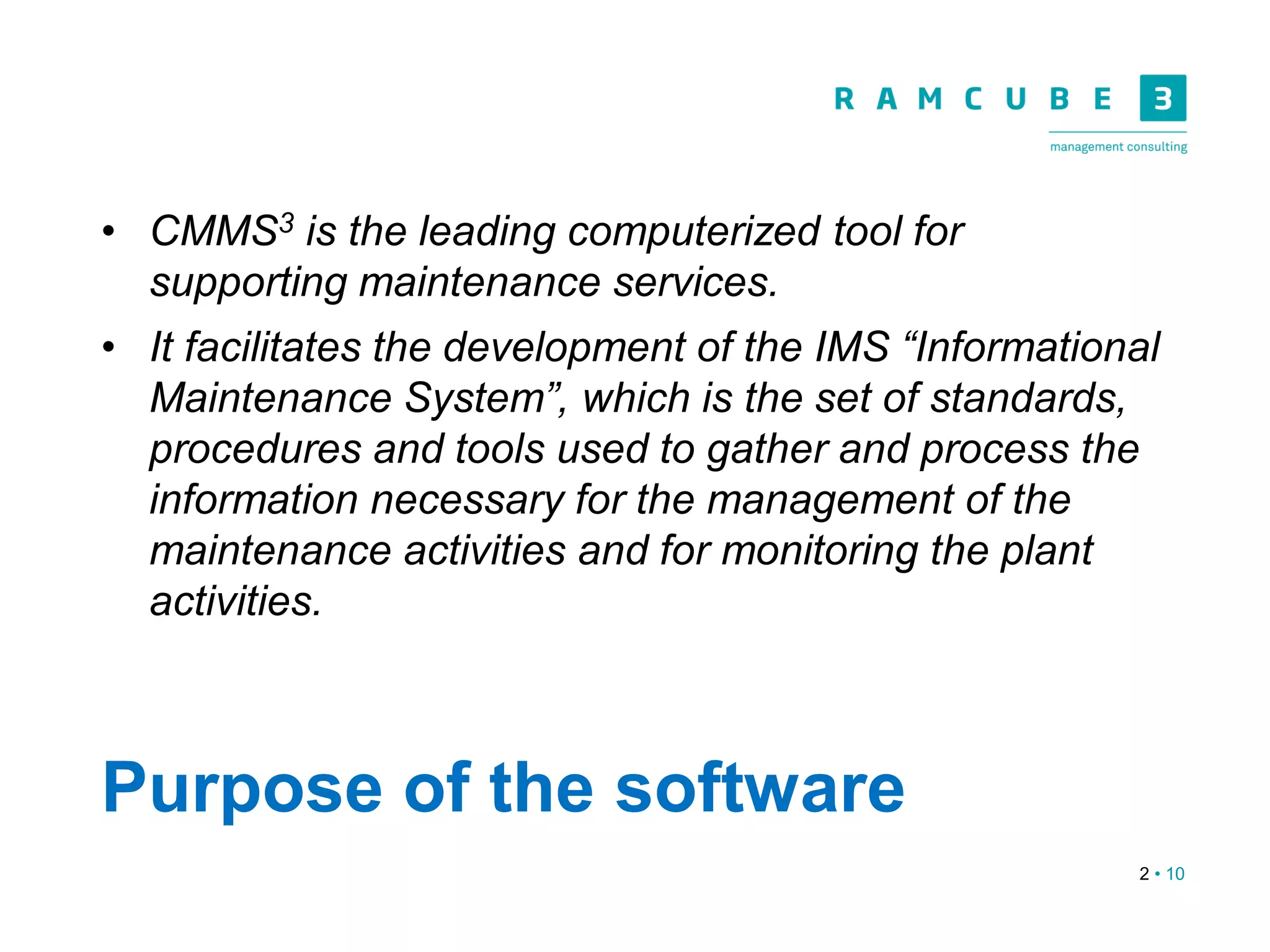 CMMS3 is a leading computerized maintenance management system designed to enhance maintenance services through the development of an informational maintenance system. It features a web-based architecture and integrates various modules for engineering, maintenance, and human resources management while aiming for reduced costs and optimized resource use. Key advantages include system scalability, integrated business intelligence, and rapid implementation and training.