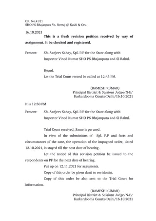 This document summarizes a court case revision petition hearing. The judge stayed the operation of the previous court order from October 12, 2021 until the next hearing date of November 12, 2021. The revision petition notice was ordered to be issued to the respondents. The trial court record was reviewed and the special public prosecutor and police inspector were present to provide submissions.