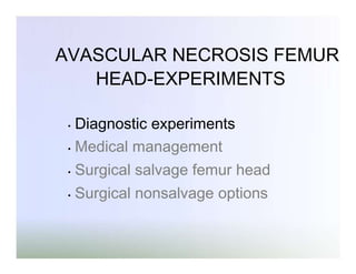 This document summarizes experiments on avascular necrosis of the femoral head. It discusses diagnostic experiments including MRI diagnosis and isotope scanning. It also discusses non-surgical interventions such as restricted weight bearing, pharmacological agents, hyperoxygenation, bisphosphonates, and core decompression with adjunct therapies. Surgical interventions discussed include core decompression, core decompression with bone morphogenetic protein and autologous bone marrow, and total hip replacement for advanced cases.