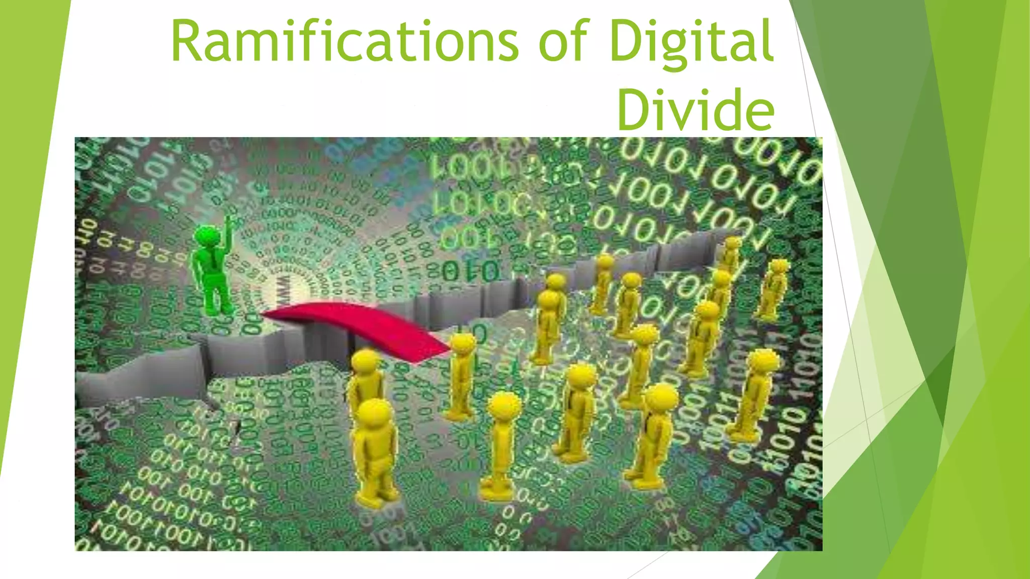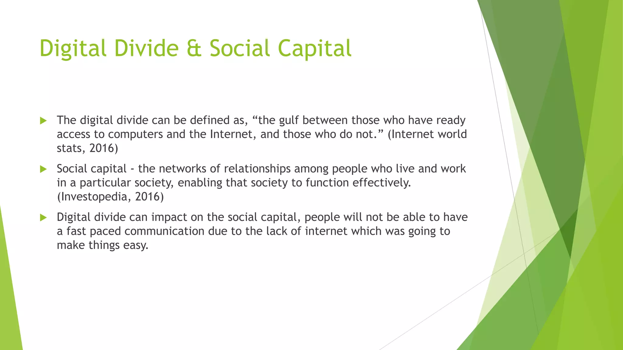 The document discusses the ramifications of the digital divide on social capital, knowledge capital, and human capital. The digital divide is defined as the gap between those who have access to computers and the internet and those who do not. It can impact social capital by hindering fast-paced communication. It affects knowledge capital by making it difficult for employees to enhance their talents without internet access. It also impacts human capital by preventing individuals from gaining new skills and knowledge online to increase their economic value. The document recommends that governments address this by subsidizing internet providers, improving rural infrastructure, and educating people to bridge the digital divide.