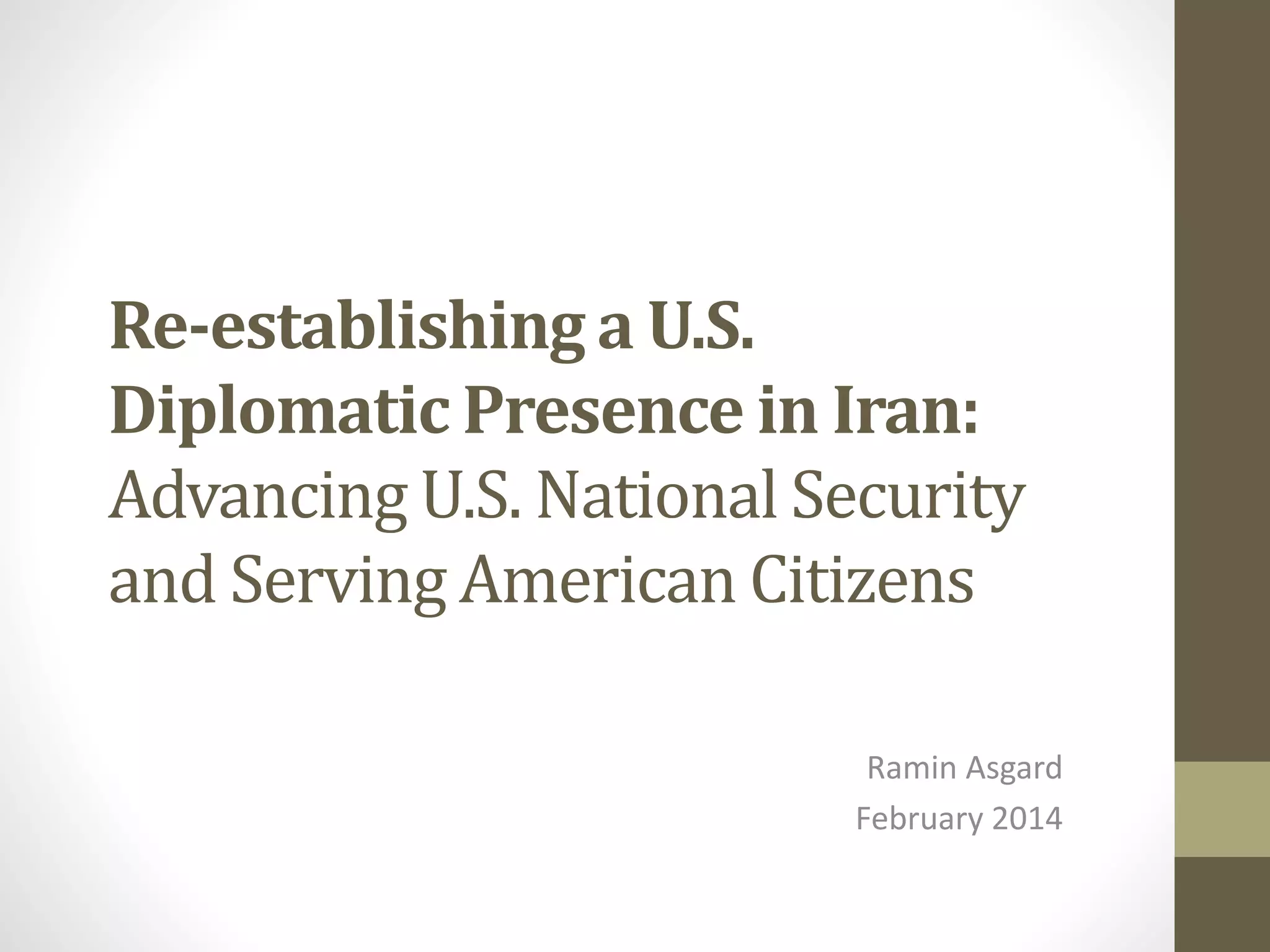 The document argues that re-establishing a U.S. diplomatic presence in Iran would advance American national security and better serve U.S. citizens. It notes that the U.S. lost its ability to understand events in Iran after losing its embassy in 1979. A diplomatic presence could help formulate policy and provide consular services. While some argue this could reward Iran, the document contends now is an opportunity with nuclear negotiations ongoing and Iranian-American citizens would benefit from improved access. A phased approach starting with interests sections could test the waters and address security concerns.