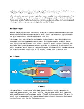 This document discusses the science behind ramjet engines. It begins with the history and evolution of ramjets from their conception in 1913 to modern applications. The core components of a ramjet - the inlet, combustion chamber, and nozzle - are explained. Ramjets work by compressing incoming air without moving parts and mixing it with fuel for combustion. Dual-mode scramjets can operate with both subsonic and supersonic combustion. While ramjets are most efficient at supersonic speeds, limitations exist such as inability to operate in a vacuum. Modern applications include missiles, aircraft, and innovative antimatter research.