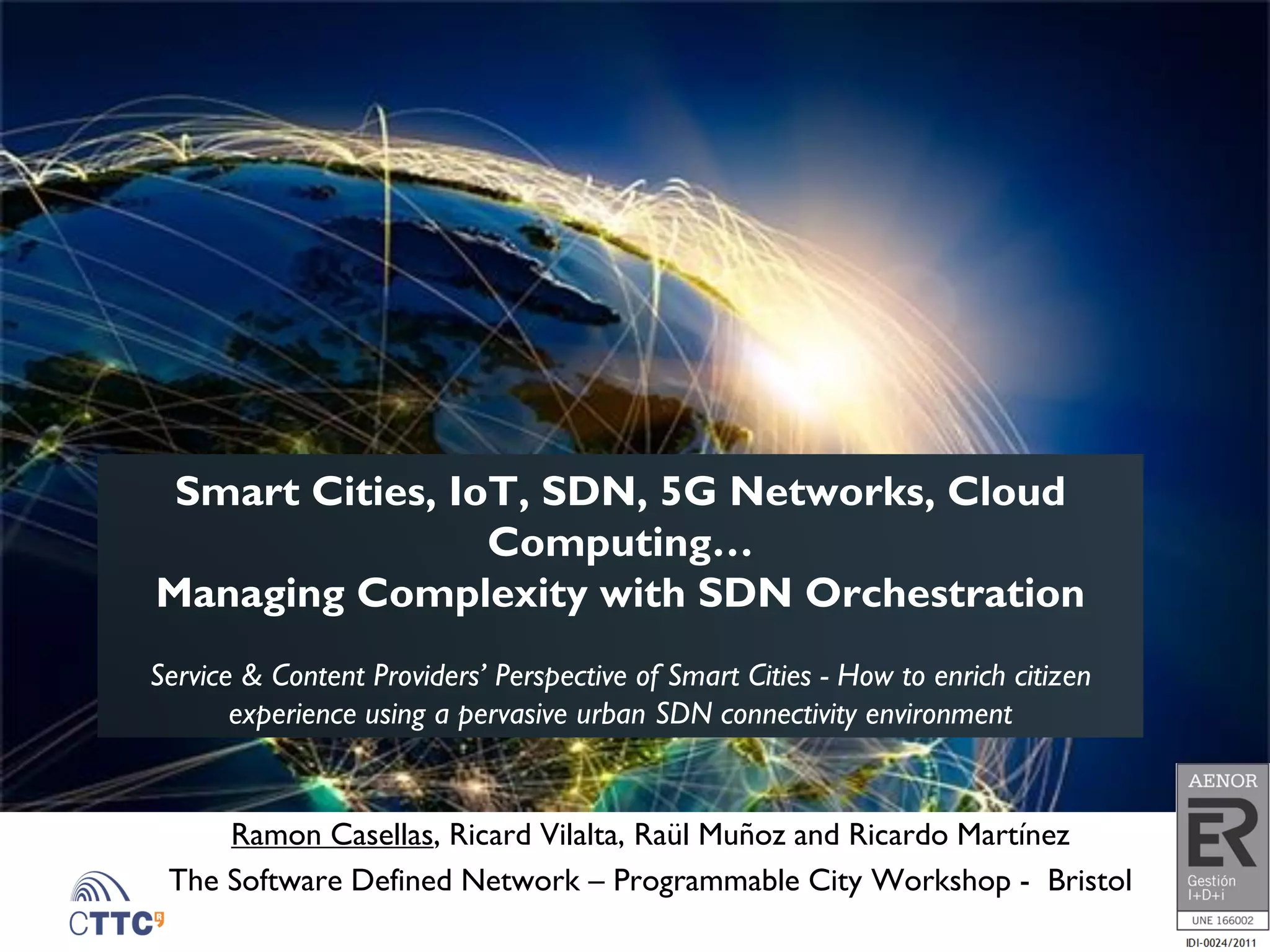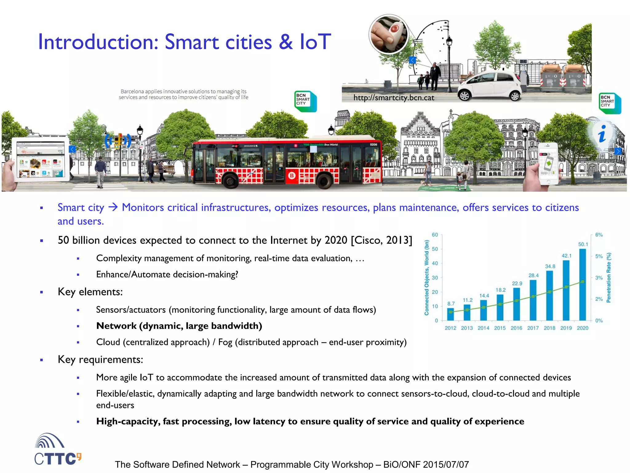 The document discusses the essential role of Software Defined Networks (SDN) in the evolution of smart cities, highlighting the need for a flexible, dynamic infrastructure to manage the increasing complexity and data from numerous IoT devices. It emphasizes the integration of SDN principles within a city operating system (CityOS) for improved network visibility and control, and calls for open standards to facilitate collaboration and innovation across different city services. Additionally, it points out the necessity for testbed deployments to evaluate and enhance these systems effectively.