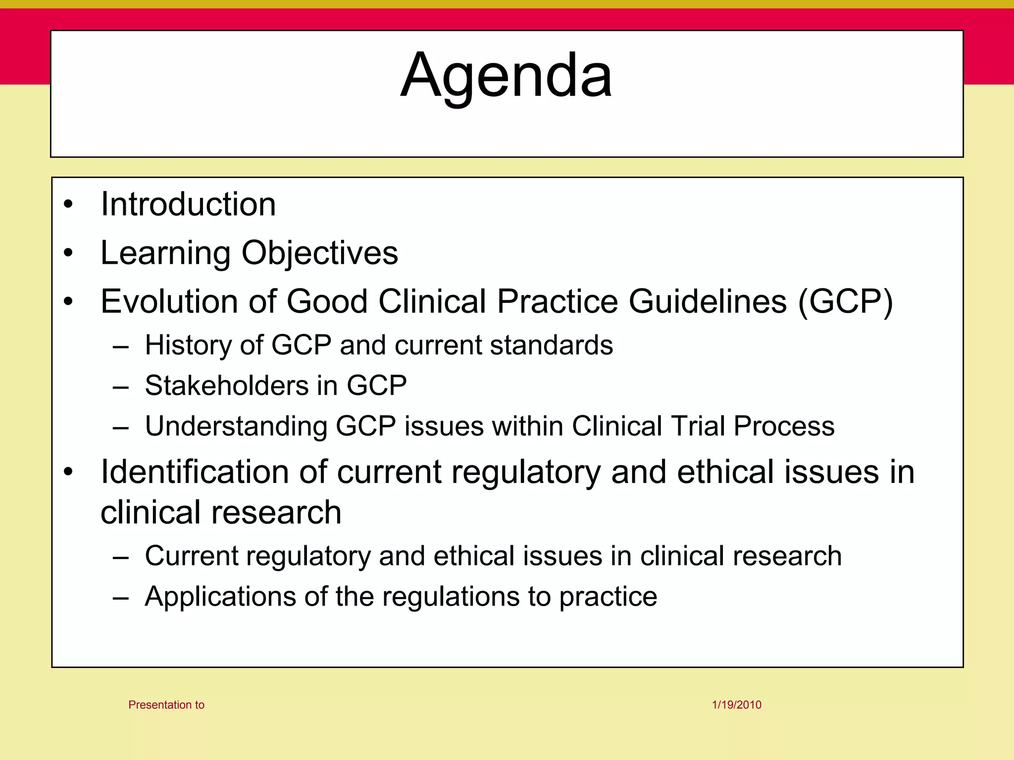 This document discusses guidelines for good clinical practice (GCP) and the drug development process. It provides an overview of the history and purpose of GCP, outlines the roles and responsibilities of various stakeholders in clinical trials, and reviews the drug development phases from pre-clinical research through post-marketing studies. Key aspects of GCP covered include informed consent, responsibilities of investigators and sponsors, and requirements for ethics committee and regulatory approvals. The presentation aims to educate about current standards and regulations for clinical research.