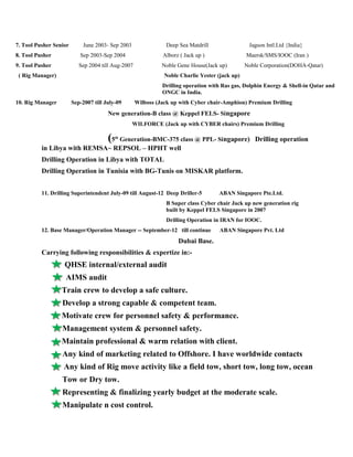 This resume is for Ram Kumar applying for the position of Rig Manager/Drilling Superintendent. It provides details of his contact information, passport and visa details, date of birth, nationality, and marital status. It then outlines his extensive oil field experience from 1988 to the present, holding positions from Roughneck to Rig Manager on rigs in India, Indonesia, Iran, Qatar, Libya, and Tunisia. It lists his qualifications and safety, management, and drilling courses. It highlights his achievements in successfully drilling various well types and outlines his computer, rig equipment and upgrade experience. The resume demonstrates Ram Kumar's long career in offshore drilling with increasing levels of responsibility.