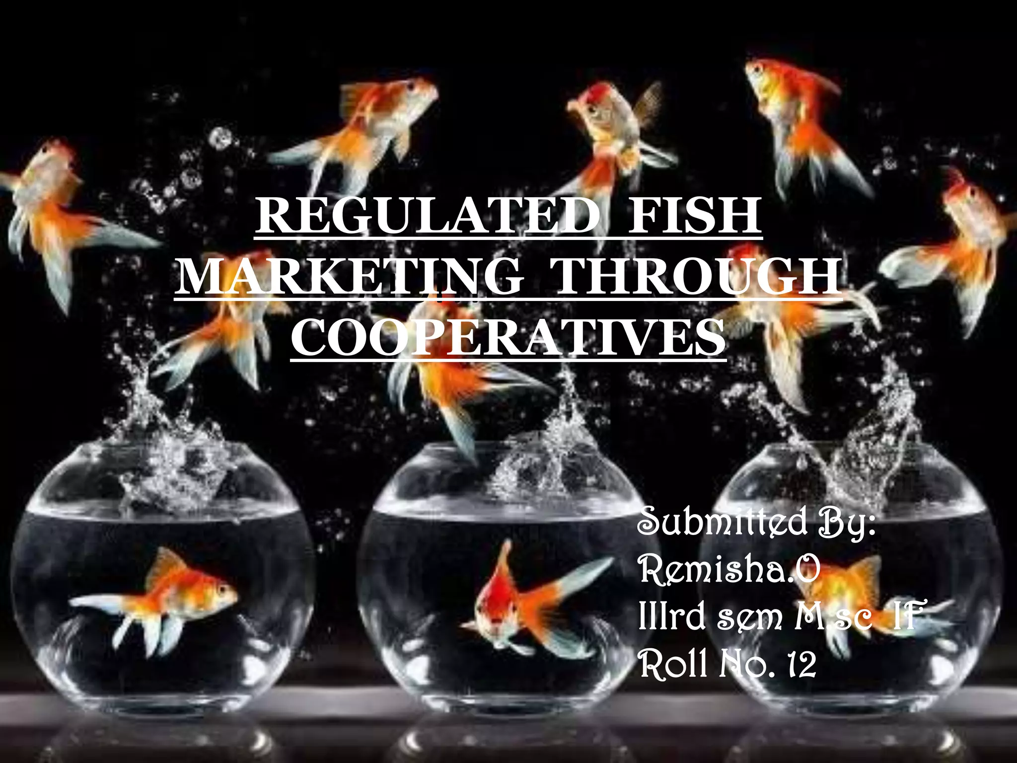 Regulated fish marketing through cooperatives. Cooperatives are user-owned organizations that can provide benefits like increased bargaining power and product quality to members. In fisheries, cooperatives help members purchase supplies at lower costs and market catch. Successful cooperatives require professional management and cooperation among members. While challenges exist in starting cooperatives, they can improve market access for small producers and generate income if properly implemented.