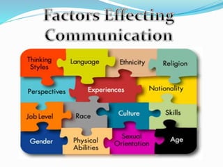 This document discusses various factors that can affect communication effectiveness. It notes that communication is the transmission of knowledge, ideas, and thoughts between people. Effective communication can be impacted by language barriers, choice of communication channel, credibility of the source, disabilities, cultural and social differences, attention, body language, and other factors like noise or lack of shared context. Overall, the document explores many possible barriers and considerations for ensuring understanding between parties in a communication exchange.