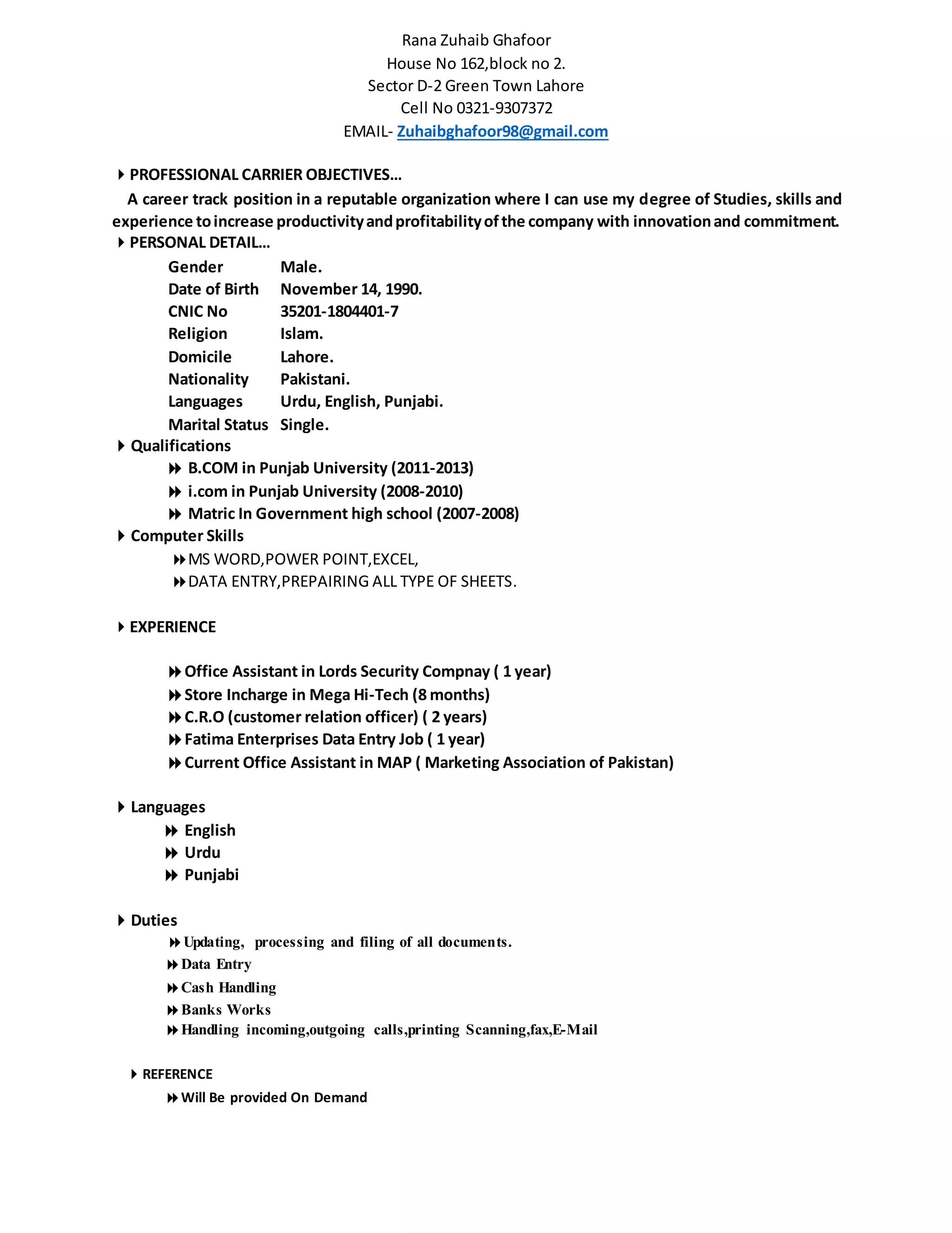 This document contains a resume for Rana Zuhaib Ghafoor. It includes his personal details, contact information, professional career objectives, qualifications including a B.Com and i.com from Punjab University, computer skills in MS Office, previous work experience in roles like Office Assistant and CRO, languages of English, Urdu and Punjabi, duties including data entry and cash handling, and an offer to provide references.