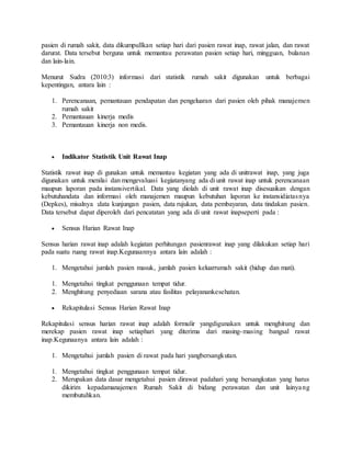 Dokumen ini membahas pentingnya statistik rumah sakit sebagai alat untuk meningkatkan efisiensi rawat inap melalui pengumpulan dan analisis data pasien. Beberapa indikator efisiensi seperti BOR, AVLOS, TOI, dan BTO digunakan untuk menilai dan memantau kinerja unit rawat inap. Penggunaan grafik Barber Johnson juga dijelaskan sebagai metode visualisasi untuk menilai efisiensi pengelolaan rumah sakit.