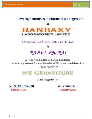 This document is a final report on the leverage analysis in financial management of Ranbaxy Laboratories Limited, prepared by Rahul Rai as part of his BBA program. It covers topics such as the company's profile, financial analysis, leverage, and capital structure, highlighting the importance of financial management in decision-making. Acknowledgments are made to various individuals and the college for their support during the project.
