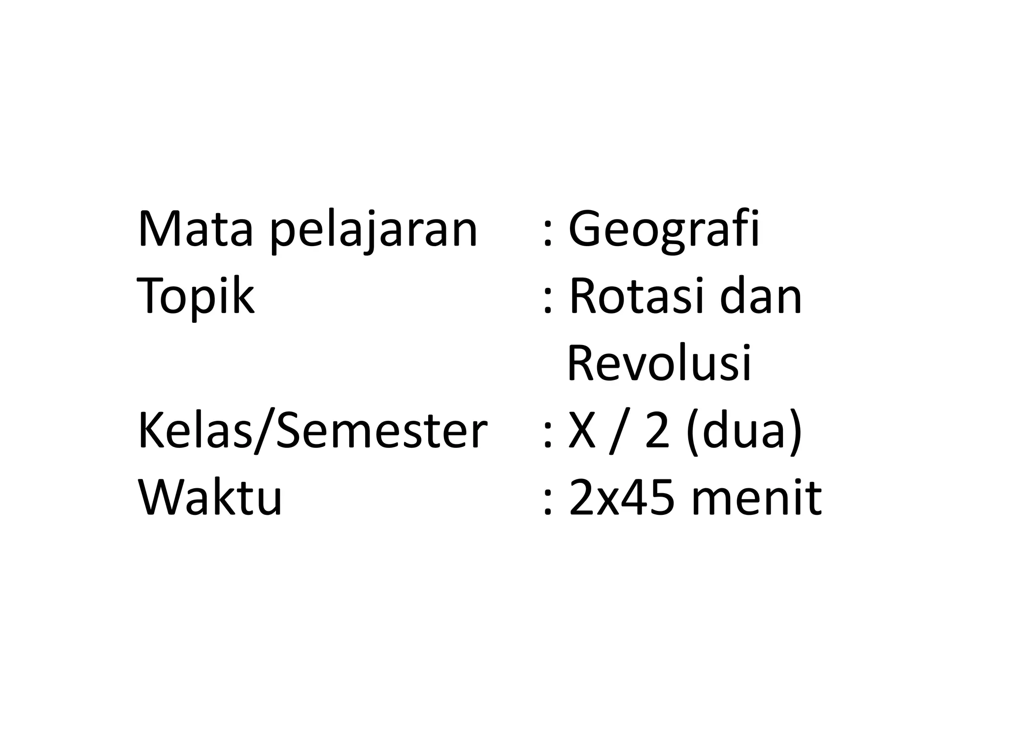 Dokumen ini membahas tentang konsep rotasi dan revolusi dalam geografi untuk kelas X, dengan tujuan pembelajaran mencakup definisi, pemahaman peristiwa terkait, dan dampaknya. Penjelasan meliputi rotasi bumi, yang menyebabkan siang dan malam serta perbedaan waktu, dan revolusi bumi, yang mempengaruhi pergantian musim dan durasi siang malam di kutub. Selain itu, dokumen juga menyentuh tentang revolusi bulan dan dampaknya terhadap pasang-surut air laut.