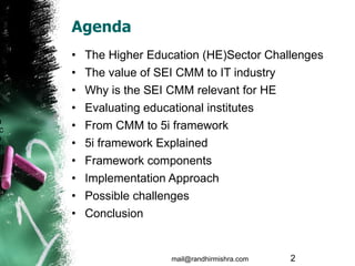 The document discusses challenges in the higher education sector, including inadequate courseware, industry disconnect, and the need for improved accreditation processes. It introduces the Capability Maturity Model (CMM) as a framework to evaluate and enhance the maturity of educational institutions, transitioning from CMM to the 5i framework which emphasizes intellect, infrastructure, industry ties, institutionalization, and internationalization. It concludes that adopting a collaborative approach and technology will drive significant improvements in education quality and effectiveness.