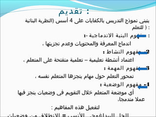 تتناول الوثيقة مفهوم الوضعية المشكل في التعليم، وتقدم طرقاً لتدريسها من خلال مسائل علمية تعتمد على تصور التلميذ والتمثلات الذهنية. تشدد على أهمية دمج المعرفة عبر أنشطة تعليمية تتفاعل بشكل صحيح مع التحديات التعليمية، كما تقدم خطوات بناء الوضعية الاندماجية وتحديد العوائق المعرفية للطلبة. توصي بضرورة تدريب المعلمين على كيفية صياغة وضعيات مشكلات لتسهيل التعلم وتحقيق الأهداف التعليمية.