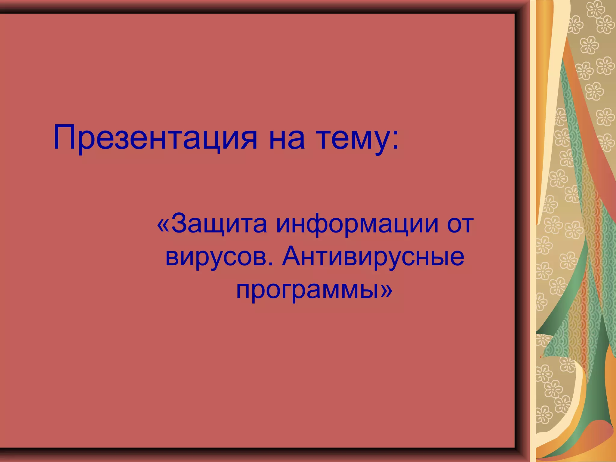 Документ представляет собой презентацию о защите информации от вирусов и антивирусных программах, описывающую два основных продукта: Касперского и Dr.Web. Программные решения предлагают базовую защиту от вирусов, троянских программ, шпионского ПО с возможностью проверки файлов, почтовых сообщений и интернет-трафика. Упоминается история разработки Dr.Web, включая их инновации и достижения на международных тестированиях антивирусов.
