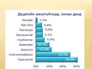 - #27 Энэ графикаас харахад нийт ажилгүйчүүдийн 30.9% нь Чингэлтэй, 25.4 % нь Сонгинохайрхан, 11.6% нь Баянгол, 10.1% нь Баянзүрх, 6.4% нь Сүхбаатар, 5.1 % нь Багахангай, 5.0% нь Багануур, 4.4 % нь Хан-Уул, 1.1% нь Налайх дүүрэгт тус тус амьдарч байна.