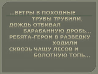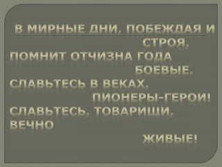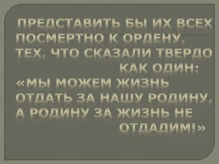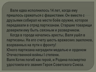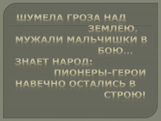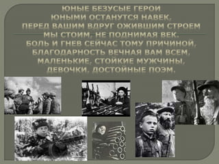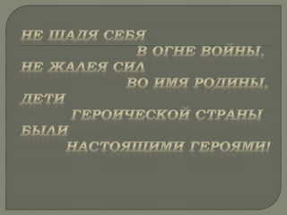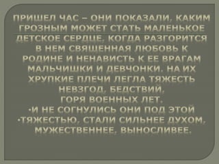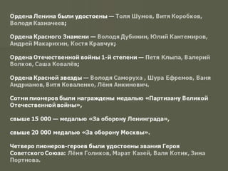 Документ повествует о юных героях, которые сражались на фронте в годы Великой Отечественной войны, показывая их мужество и отвагу. В нем описаны судьбы мальчиков и девочек, которые, несмотря на свой юный возраст, внесли значительный вклад в борьбу против фашистов. Также представлены награды и посмертные признания, полученные этими юными героями за их подвиги.