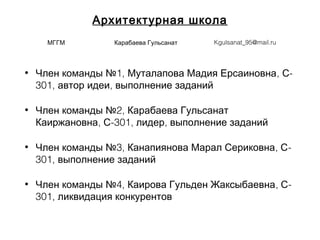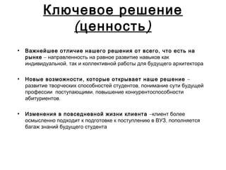 Документ описывает программу архитектурной школы, которая направлена на развитие навыков индивидуальной и коллективной работы будущих архитекторов. Основные преимущества включают индивидуальный подход к обучению, проведение курсов и экскурсий, а также доступность для жителей Павлодара. Программа способствует подготовке абитуриентов к поступлению в архитектурные вузы и повышению их конкурентоспособности.